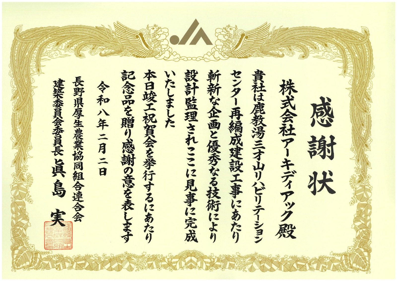鹿教湯三才山リハビリテーションセンター鹿教湯病院の竣工祝賀会が開催されました。長野県厚生農業協同組合連合会から感謝状を頂きました。今後も発注者や地域医療に対して貢献できる様に邁進して参ります。
